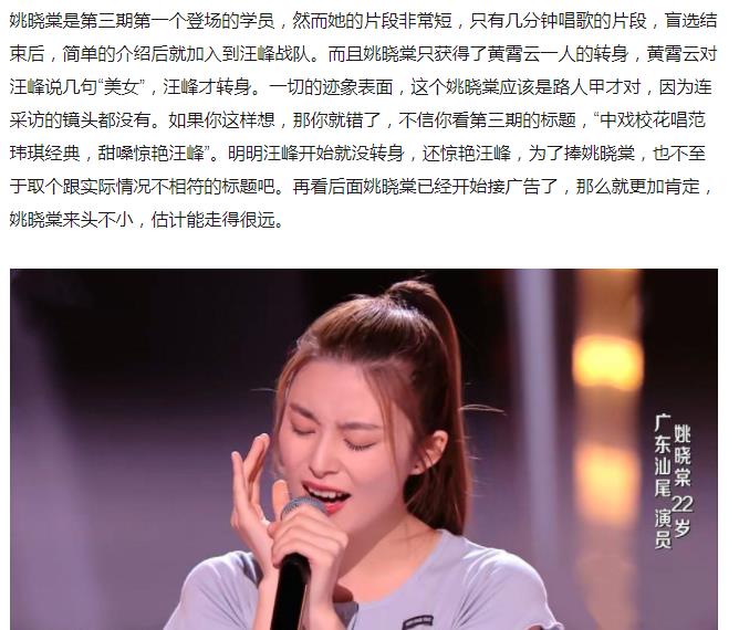 目前,《2021中国好声音》八强出炉:汪峰战队王馨、姚晓棠,李荣浩战队王靖雯、王泓昊,李克勤战队贺三、伍珂�h,廖昌永战队张露馨、陈文非荣耀晋级全国八强。当初姚晓棠刚登上舞台的时候,被认为是关系户,一开始只有黄霄云转身了,然后对汪峰说了美女,汪峰也随即转身,最终简单介绍后就加入了汪峰战队,加入汪峰是她自己选择的。