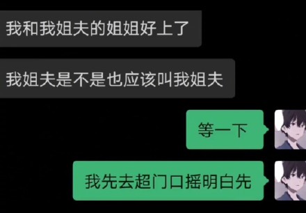 在很多超市、药店的门口会有一些卡通造型的“摇摇车”,投币一元之后,会播放出一些童年音乐,比如:“爸爸的爸爸叫什么?妈妈的爸爸叫什么...”、“我有一个好爸爸,好爸爸...打起屁股....啪啪啪”....因为摇摇车的音乐,诞生了一个梗叫:“去超市门口摇明白”,这里摇明白的意思就是“搞清楚亲戚之间的人物关系、称呼”,比如有一个段子是:“我和我姐夫的姐姐好上了,那我姐夫是不是也叫我姐夫?”,这个段子就会让人对人物关系一头蒙,于是可以说“等我先去超市门口摇明白”。。。